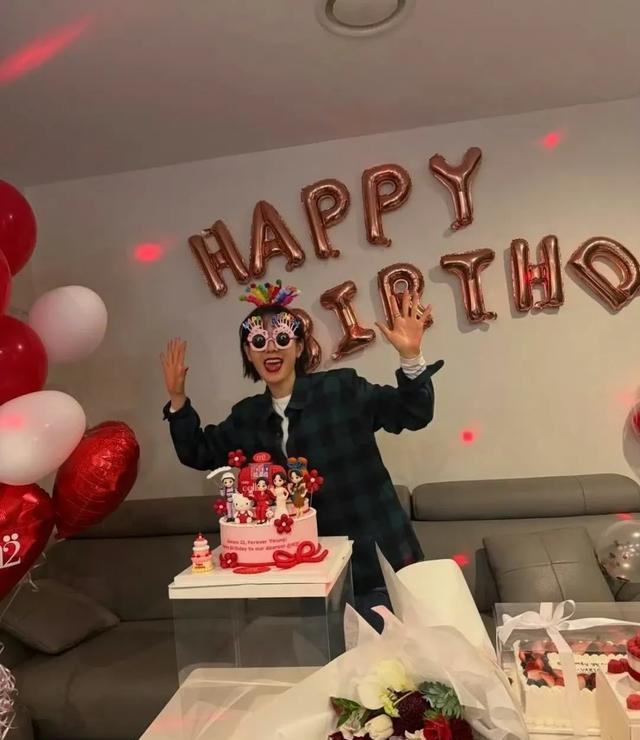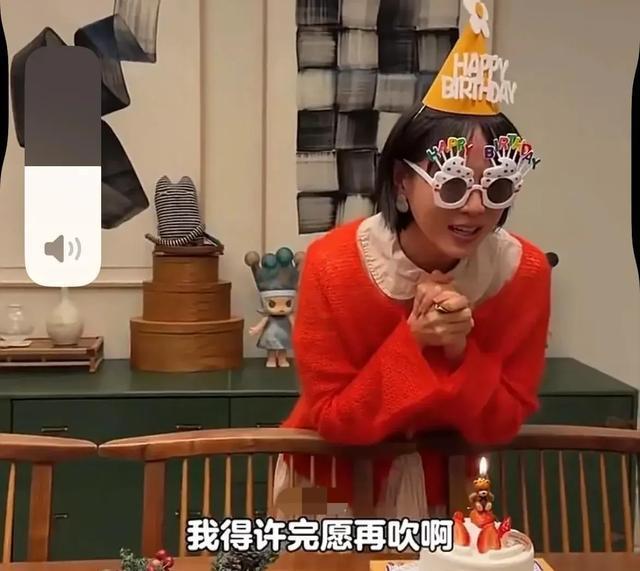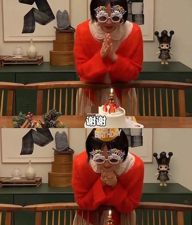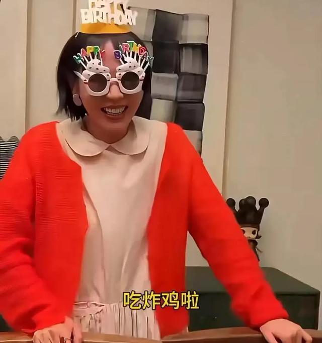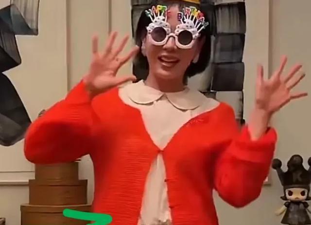 视频中的她,身穿娃娃领棉质长裙,外搭了一件红色开衫,打扮的像个18岁少女。还特意配合儿子,戴上了寿星帽子和墨镜,看上去少女心满满,相当青春有活力!