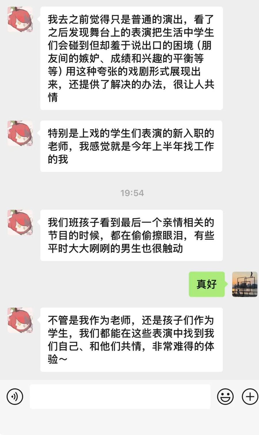 观看演出的学生留言说,“演员们全情投入,用生动的台词、自然的动作,演绎着校园生活里的友情、成长与担当,一个个熟悉的场景让我感同身受,激励我在今后的学习中勇敢追梦,在与同学相处时真诚相待,做一个有温度、有担当的少年。”