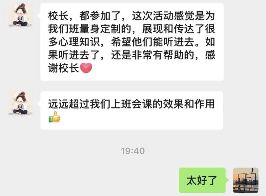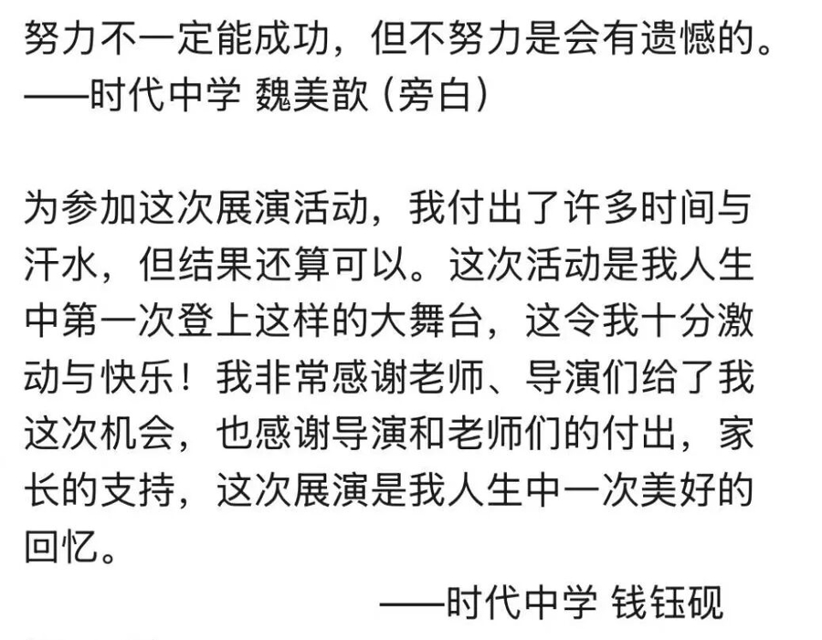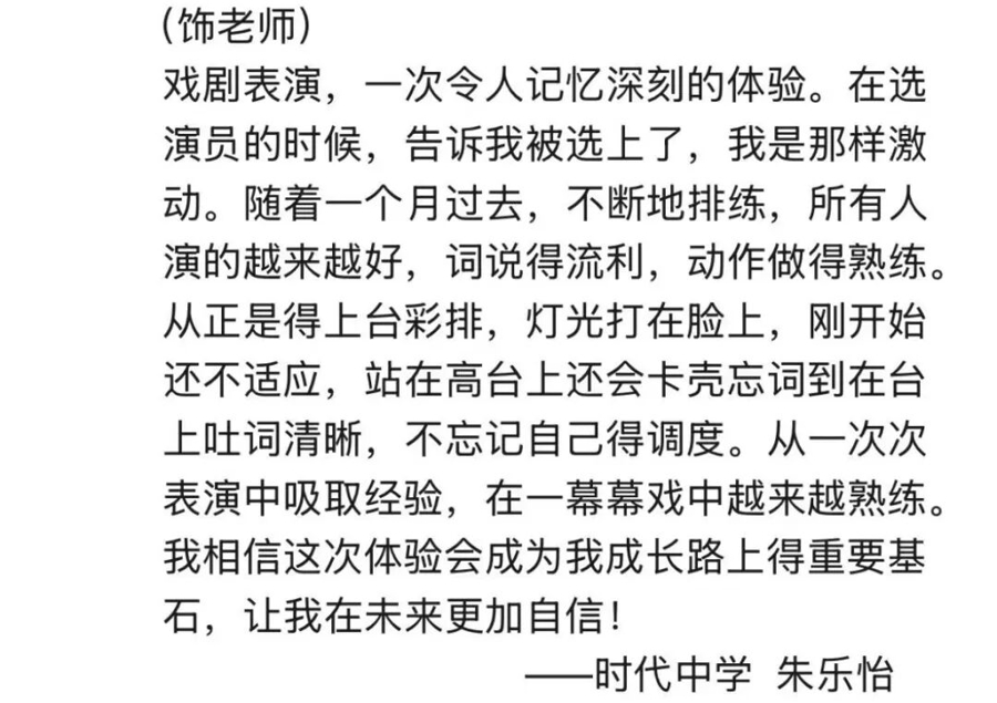 “作为一位母亲特别感激老师们的用心策划,这次展演不仅是一场表演,更是孩子心灵成长的活教材。”有学生家长表示,戏剧教会家长们耐心等待比急功近利更重要,每一个错误都是蜕变的机会。“谢谢你们为孩子搭建的这个舞台,它让家长们更坚信,孩子们能一步步走向更好的自己!”
