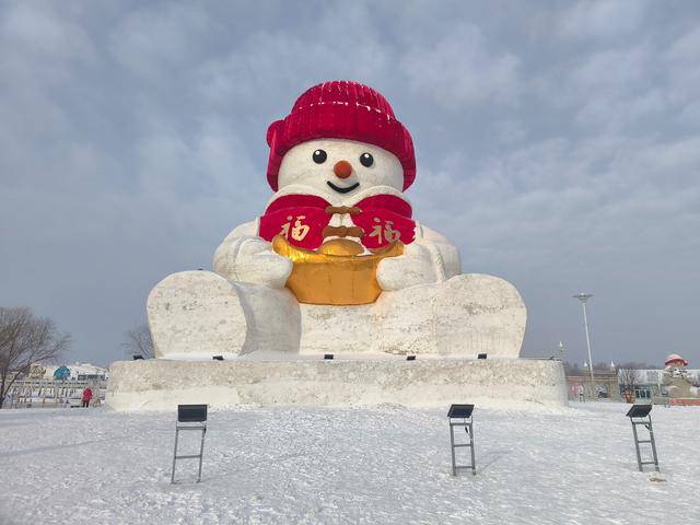 园区不仅有380米双道并行的冰滑梯,让游客体验极速滑行的激情,更有增高3米的26米招财大雪人矗立江畔。大雪人造型独具中式韵味,头戴中式福纹帽,身披锦绣红福中式马甲,圆润饱满的身躯由晶莹白雪塑就,在冬日阳光下泛着温润光泽。